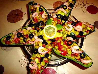 Наполнить вычищенные авокадо салатом, выложить на блюдо, украсить по своему вкусу и подать к столу.