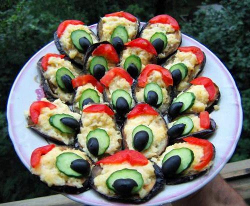 На поджаренные ломтики баклажана выложить сырно-майонезную массу и украсить ломтиками свежего огурца, половинками черных оливок и кусочками помидора.