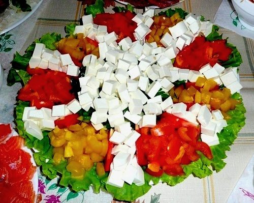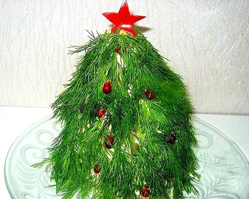На вершину помещаем звезду, вырезанную из сладкого красного перца.
