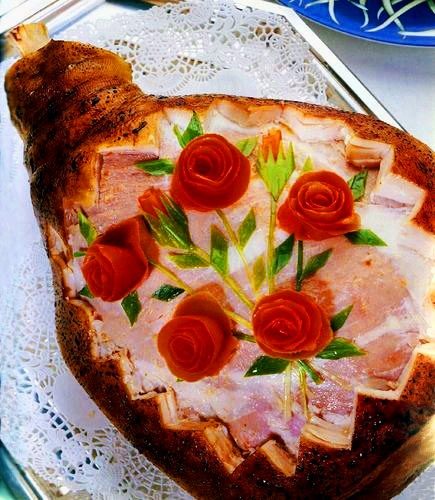 Украшение окорока «розами» и зеленью.