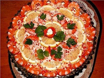 Салат из рыбы, морепродуктов с украшениями из ломтиков лимона, креветок и зелени.