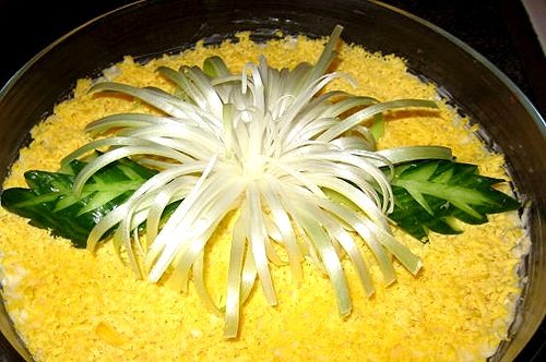 Выкладываем украшения поверх слоя тертого сыра (или тертого желтка) и подаем на стол.