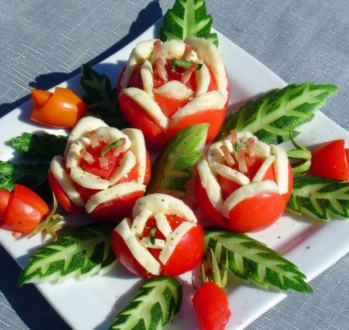 Как приготовить закуску цветы из помидоров. Сделать на каждом помидоре по 4 надреза так, чтобы получился квадрат (надрезать от попки к плодоножке, не разрезая до конца). Вставить в разрезы кусочки брынзы, сделать еще 4 разреза в помидоре в центре получившегося четырехугольника, опять вставить сыр. Нарезать соломкой ветчину и сделать из нее «тычинки», сделать в помидоре разрезы и вставить их в него. «Пестик» сделать таким же образом из брусочка огурца. Вырезать из огурцов красивые листья, выложить цветы на блюдо, поперчить и посолить.