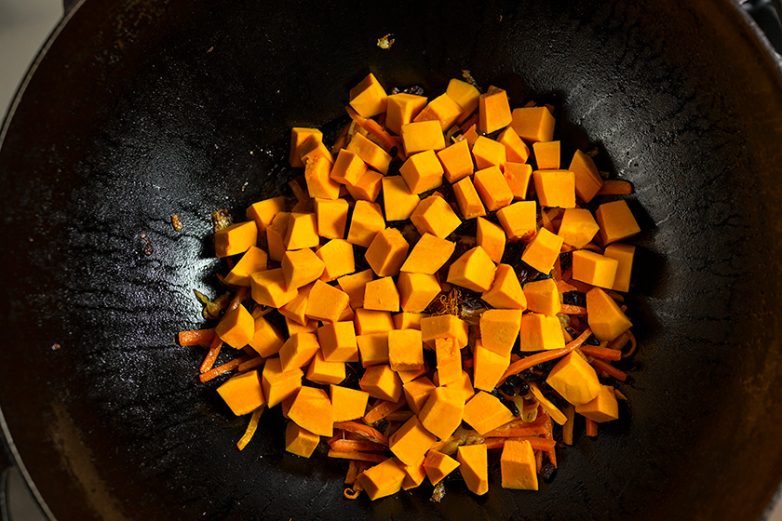 Тыкву, порезанную кубиками, закладывайте поверх моркови, под рис.