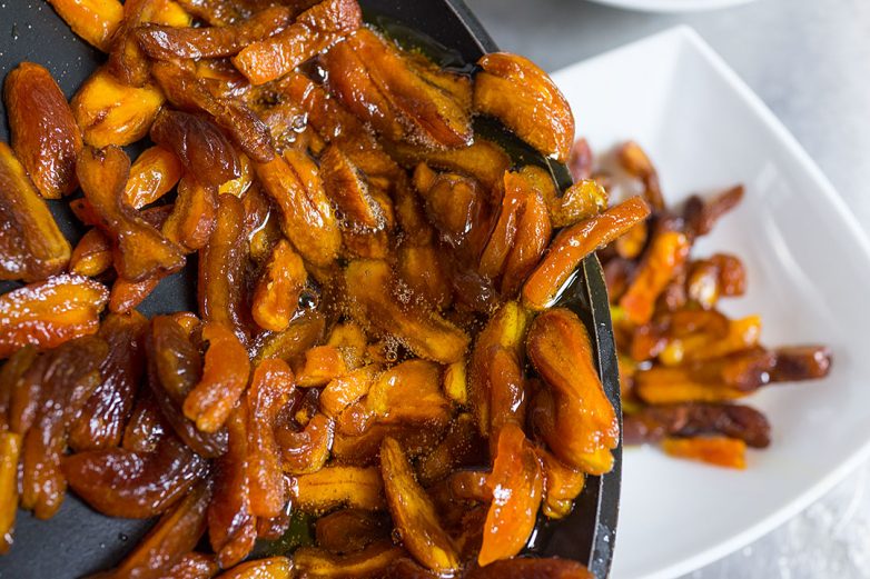 Не отходите от сковородки, потому что надо сразу же выкладывать цедру и подлить три-четыре столовые ложки воды, а потом помешивать цедру, пока она вся не покроется карамелью, пропитанной зирой.