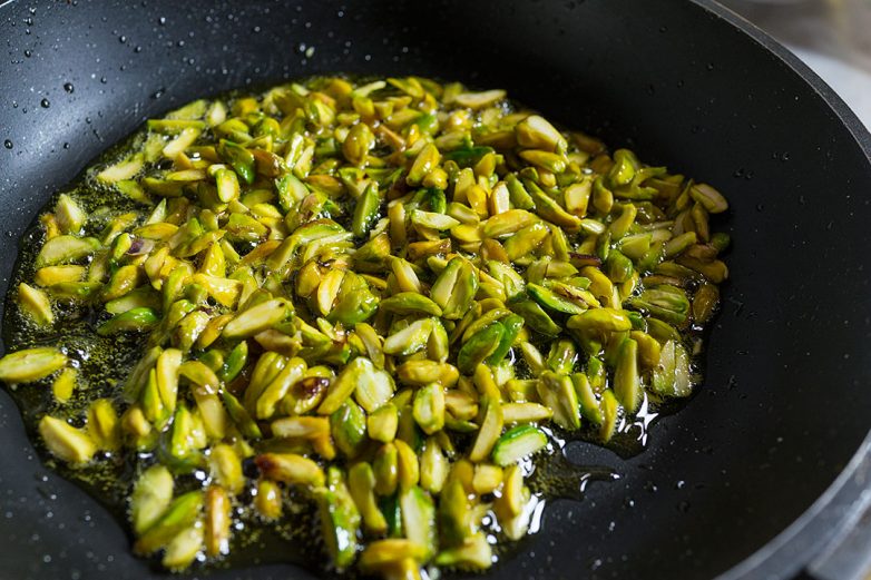 Только не ждите, когда фисташки порозовеют — ориентируйтесь исключительно на запах. Запахло вкусно-первкусно фисташками, сливайте!