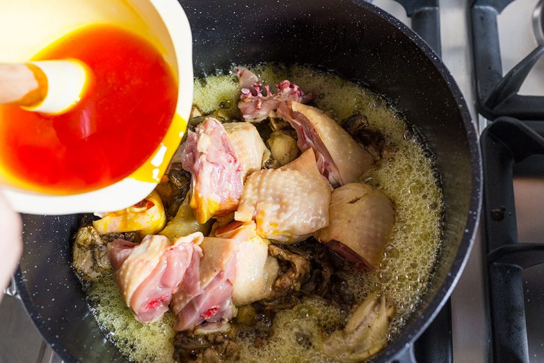 Когда лук начнет источать умопомрачительно вкусный аромат — опускайте те части курицы, что готовятся дольше — крылья и спинки.
