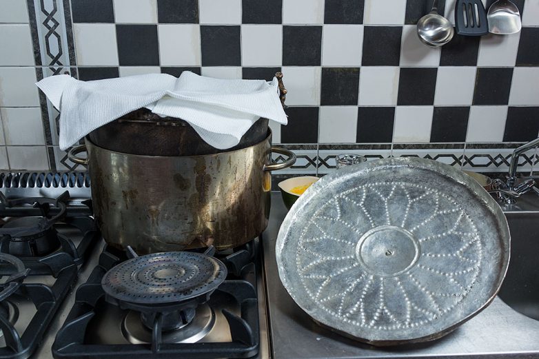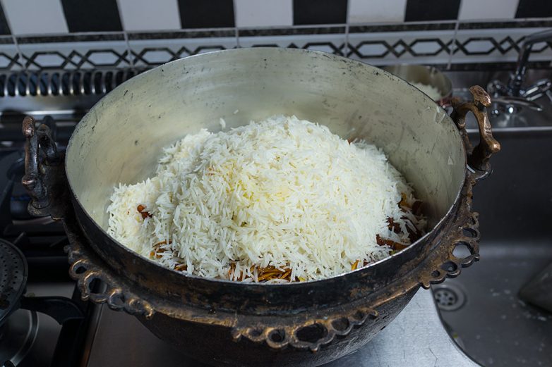 Но пусть этот момент вас не пугает — следить за казаном надо только первые 20-30 минут, прислушиваться и принюхиваться, трогать иногда крышку — нагрелась или нет. Когда казан нагреется, огонь надо будет убавить на самый малый и обязательно под казаном должен быть рассекатель, да хоть кирпич подходящего размера. Пусть там есть казмах или тахдиг, но даже и он не должен пригореть, а должен превратиться в изумительное лакомство.
