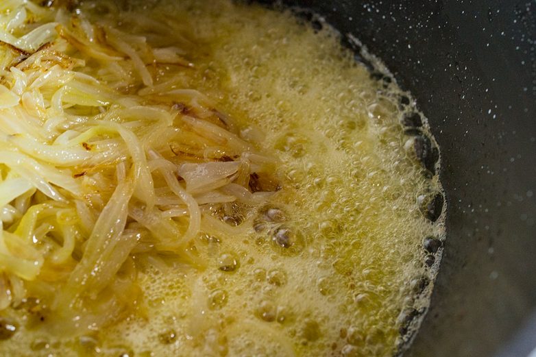 Лук надо жарить в топленом масле, постепенно понижая нагрев и часто помешивая, чтобы не пригорел.