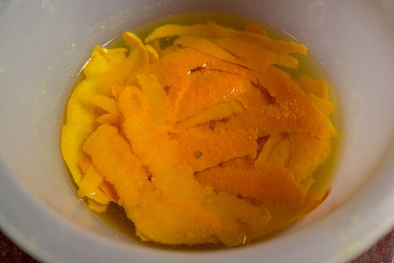 Ее потом все равно в кипятке вымачивать, несколько раз воду менять. Остывшую воду необходимо сливать с цедры и заливать ее свежим кипятком до тех пор, пока не перестанет подниматься воск — видите его на поверхности воды да по бортам миски?