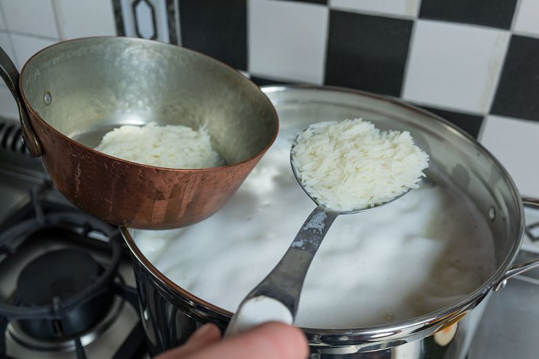 И пока рис готов только наполовину, небольшую его часть выложить в сотейник или небольшую кастрюлю.