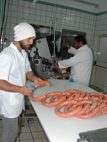 Используемая для колбас натуральная оболочка из свиных кишок закупается в Германии. Половина оборудования цеха тоже немецкого производства.