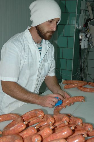 Интересно, что небольшая машина, которая дозирует и перевязывает колбасы, больше всех других приспособлений влияет на стоимость продукции. Сейчас со всей работой в цехе справляется два человека, а раньше лишь на перевязке колбас работало до 8-ми рабочих. Теперь в задачу рабочего входит только накалывать оболочку, чтобы дать выход воздуху.