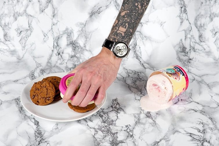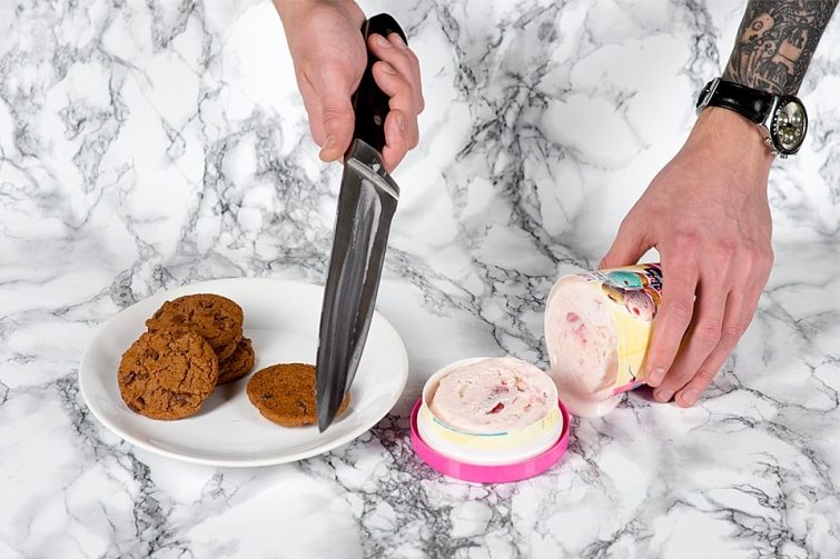 Чтобы во время приготовления такого сэндвича не измазаться мороженым, нужно просто резать его ножом прямо с упаковкой. Положить ломтик на печенье, убрать кольцо обертки, накрыть другим печеньем.