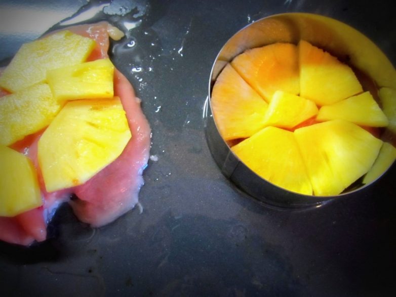 Куриную грудку без кожи приправить солью, перцем и маслом. Выложить на противень, а сверху выложить ломтики тонко нарезанного ананаса. Если у вас есть сервировочные формы, то можно в них запечь блюдо и тогда при подаче вид будет более привлекательный. Затем ставим противень в разогретую до 210-220 гр духовку и запекаем минут 7.