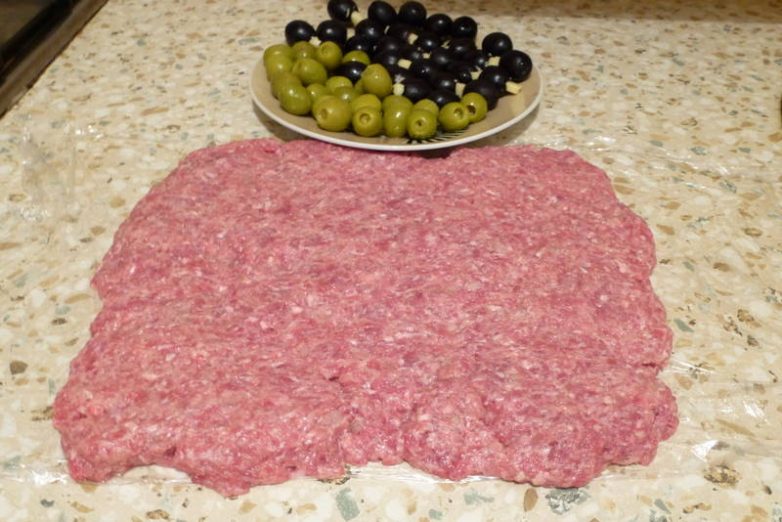 Выложите пищевую пленку на стол, смажьте растительном маслом. Фарш выкладывайте на пленку (для начинки оставьте немного фарша). Влажными руками лепите прямоугольную форму, которая станет основой для мясного рулета.