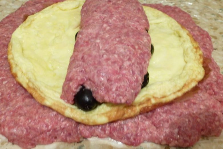 Омлет достаем из сковороды, и на него вкладываем черные оливки с сыром. На черные оливки выкладываем мясной фарш, который мы оставляли для начинки.