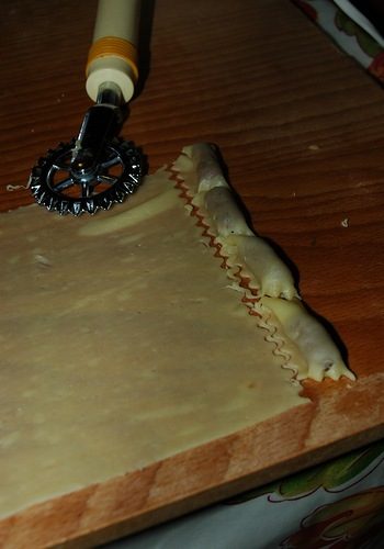 Прижимем пальцами пустоты, прокатывает роликом для пасты, отделяя фаршированный участок теста и разделяя его на кальцончелли.