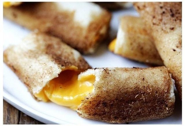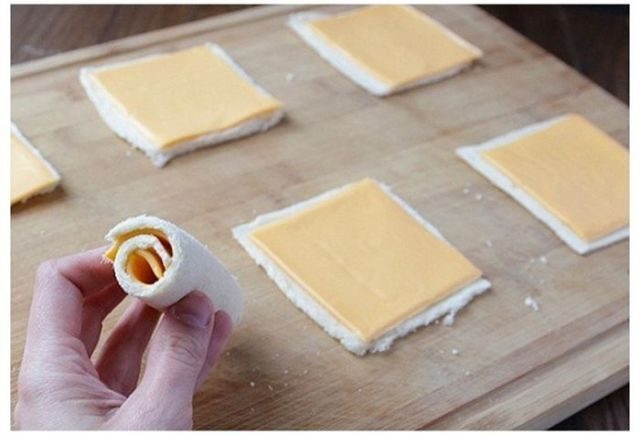 Да, ещё вариант, как показано здесь на фото. На ломтики хлеба кладёте по ломтику сыра и всё сворачиваете рулетиком. Затем, рулетики обжариваете в масле.