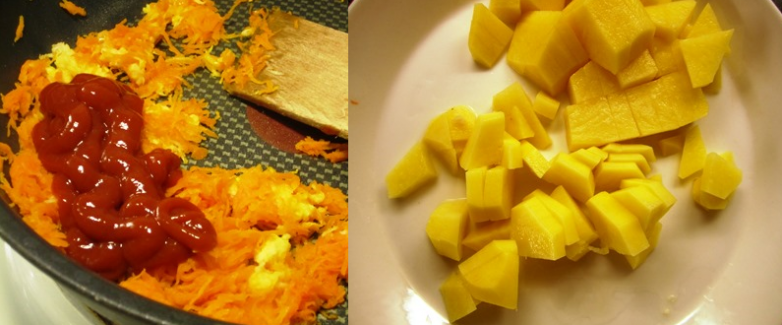 Пока варится курица и бульон, потереть морковь и потушить ее на капельке растительного масла, добавить тертый чеснок и томатную пасту. Параллельно подготовить картофель плотного сорта, промыв и порезав.