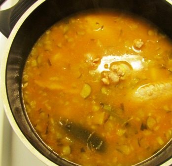 Когда курица в бульоне уже близка к готовности — всыпать немного крупы, тут хороша дробленая перловка (она же ячневая крупа). У меня была готовая смесь дробленой перловки с рисом. На ее варку требуется примерно 20 минут, так что всыпаем за 20 минут до окончания варки супа.