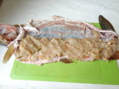 Рыбку, разрезав осторожно по брюшку, выпотрошить. Аккуратно снять кожу, но голову и хвост при этом не удалять.