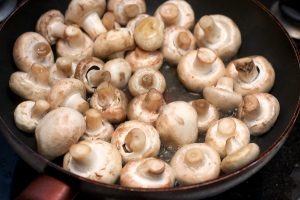 Грибы хорошо помыть и выложить на сухую разогретую сковороду, чтобы они пустили сок — жарить, помешивая 4-6 минут.