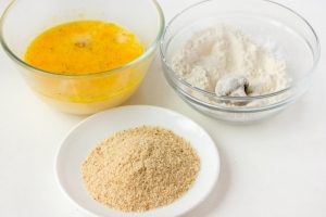 Теперь поставим рядом тарелку с панировочными сухарями, льезон, пшеничную муку. Обваливаем каждый гриб по отдельности сначала в муке, затем окунаем в льезон, затем сразу обваливаем в сухарях, ещё раз в льезон и снова обваливаем в сухарях.