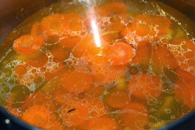 4. Добавить в кастрюльку бульон и готовить примерно 7 — 10 минут до готовности морковки.