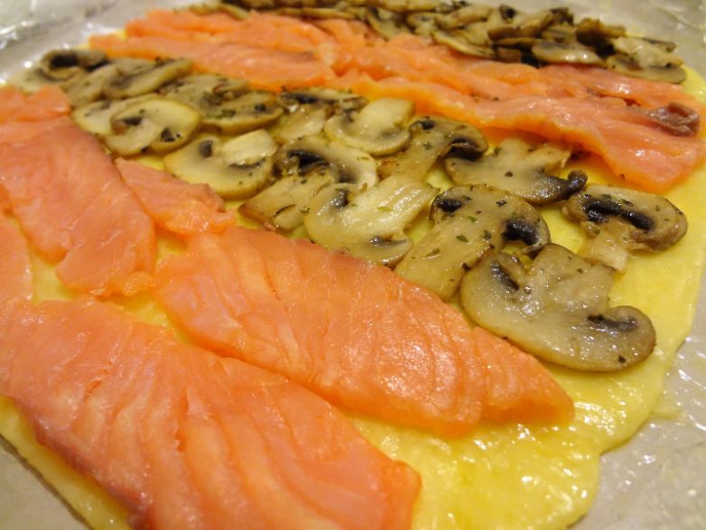 Теперь можно обрезать рукав по краю, снять пленку и разложить нарезанную красную рыбу и обжаренные шампиньоны.