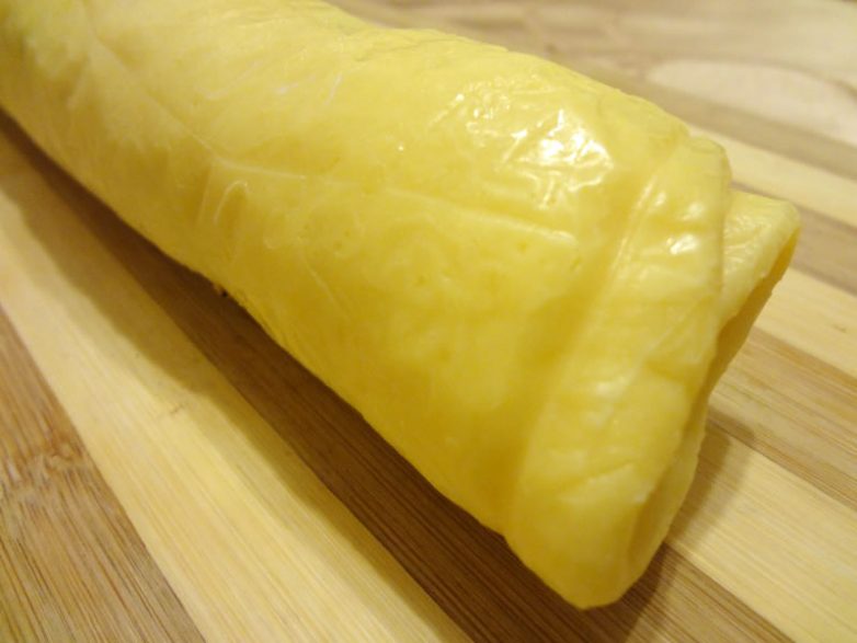 Не вынимая сыр из рукава, раскатайте его скалкой до толщины пласта 0,5 см.