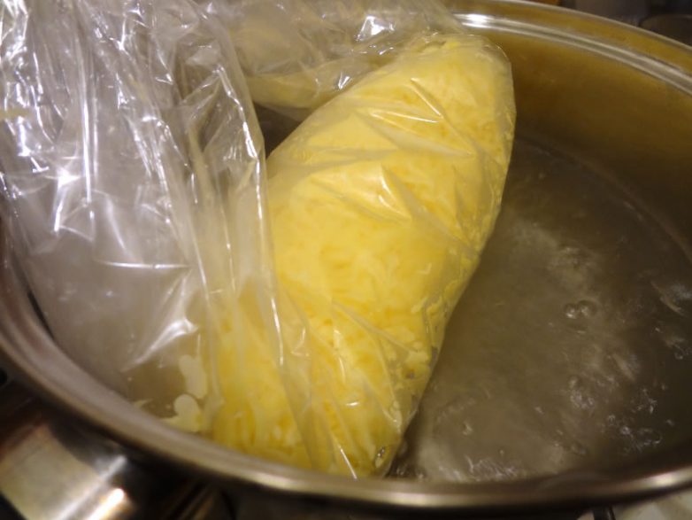 Опустите рукав с сыром в кипящую воду, придерживая его за два конца и окуная пакет в кипяток лопаткой, чтобы он не всплывал.