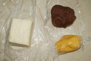 Затем разделить на нужное количество кусочков, добавить красители, вымесить и оставить 12ч под пленкой в холодильнике.