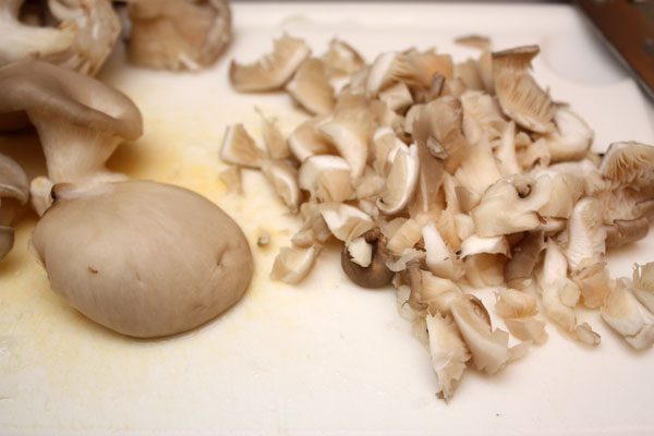 Вешенки промываем и мелко режем. Их надо обжарить на растительном масле вместе с измельченной серединой луковиц 2-3 минуты.