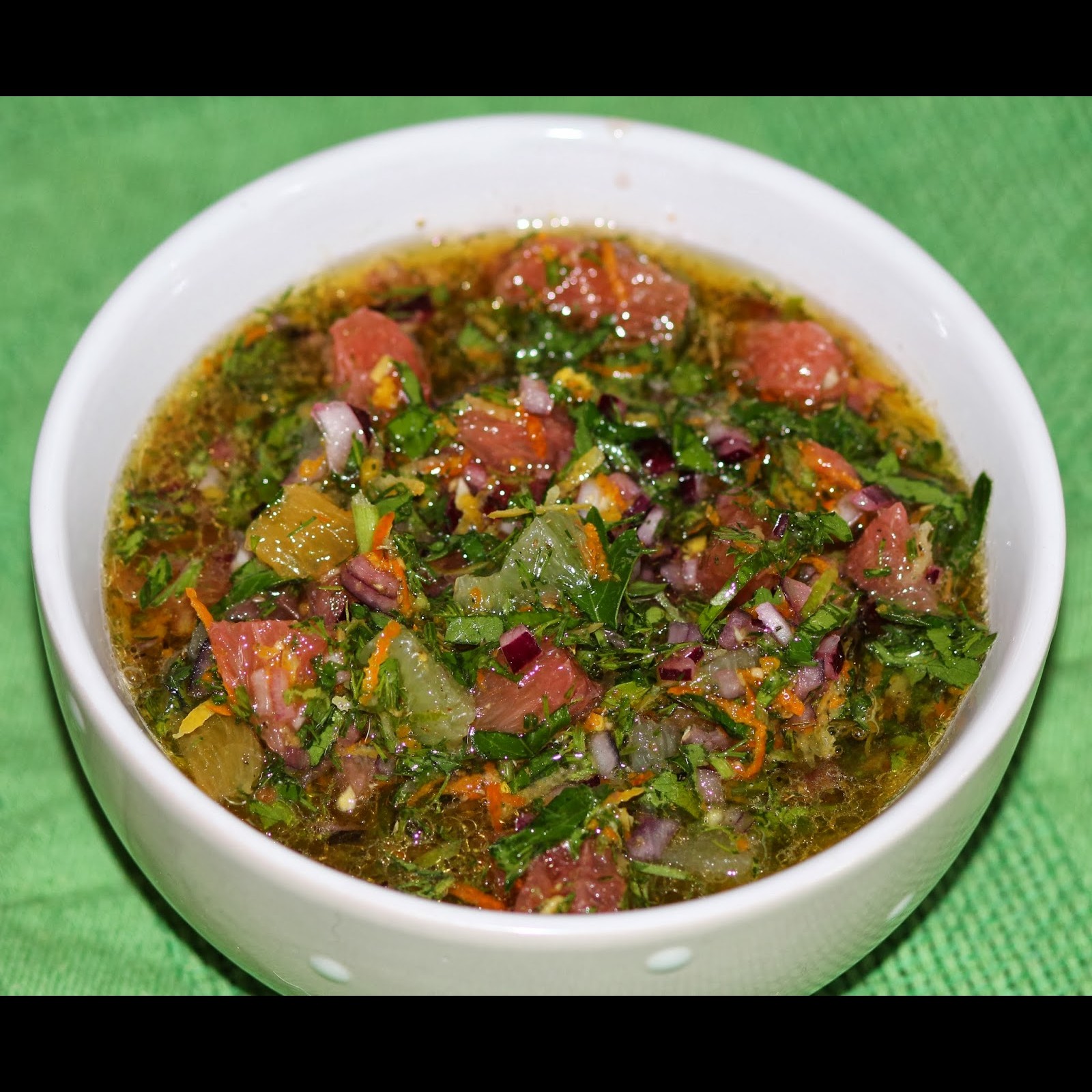 6. К цитрусам добавить, цедру лимона, лайма и апельсина, соль, сахар, приправу для рыбы, имбирь натертый на мелкой терке, оливковое масло и сок грейпфрукта, лайма и апельсина. Все хорошо перемешать.