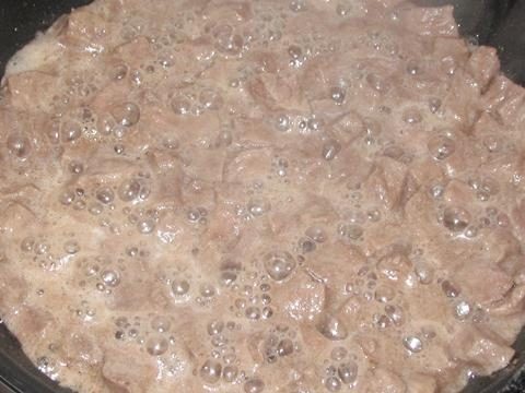 На большом огне обжарить кусочки мяса. Можно за несколько партий. После чего огонь убавить, мясо при этом даст обильный сок.