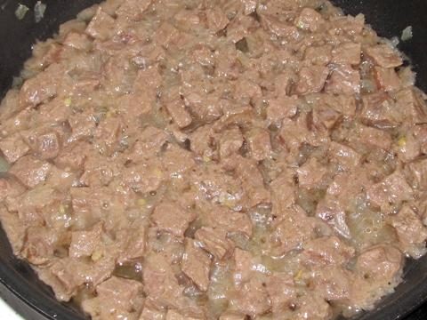 Тушить на маленьком огне до полной готовности говядины. При необходимости можно доливать в сковородку кипяток.