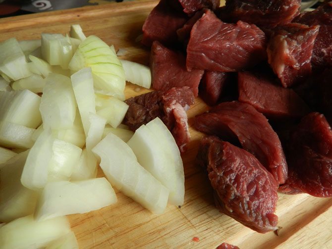 Основа любого гуляша – мясо. Лучше взять телятину, заднюю часть. То, что предлагают сетевые магазины под названием «гуляш», заранее порезав на кубики, нам не годится. Такое мясо и соседский доберман не разжует.