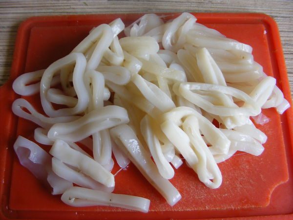 Кальмары порезать кому как нравится. Мне — кольцами.