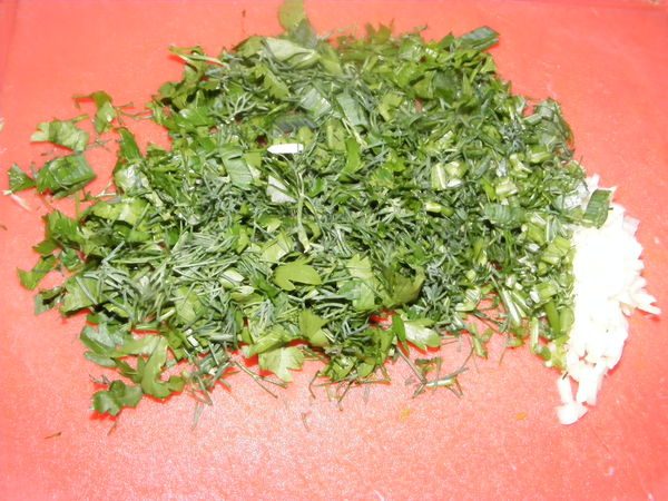 Порубить пертушку, укроп, чеснок.