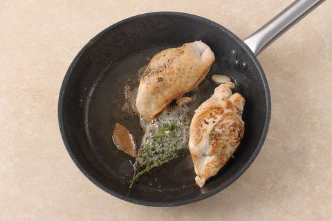 Обжарьте грудку на раскаленной сковороде на оливковом масле с каждой стороны по 3 минуты до золотистой корочки, добавьте раздавленный чеснок, веточку тимьяна и лавровый лист и сливочное масло; убавьте огонь и обжаривайте курицу еще 5-7 минут, постоянно поливая ее выделяющимся соком.