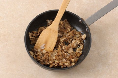 Нарежьте лук шалот мелкой соломкой и обжарьте его на 1/2 сливочного масла на слабом огне до золотистого цвета, добавьте нарезанные мелкими дольками шампиньоны и тушите в течение 5 минут до испарения жидкости.
