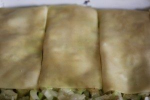 Выложить кабачки с луком, накрыть листами лазаньи.