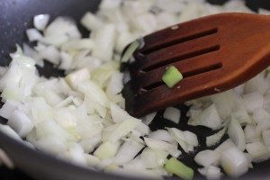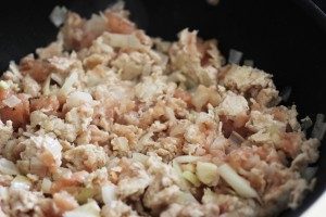 Одну луковицу нарезать мелко, а два зубчика чеснока мелко порубить и добавить к фаршу. Фарш посолить обжарить на оливковом или подсолнечном масле до готовности.
