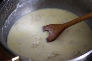 Доведите смесь до кипения и потихоньку вливайте молоко частями, постоянно помешивая, чтобы избавиться от комков.