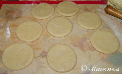 3. Тесто раскатать в пласт толщиной 5 мм и формочкой или стаканом вырезать круги диаметром 10-12 см.