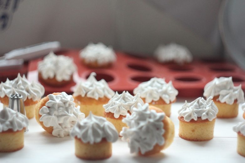 Заполнить меренгой кондитерский мешок. Украсить кексы.