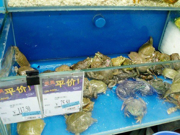 Видела, как продают живых лягушек в Китае. Было очень смешно, т.к. они всё время прыгали с весов. У этих продавцов особое терпение к лягушкам. А ещё китайцы едят голубей