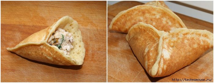 Скреплять оладушки необходимо тёплыми, выложив внутрь 1 ст.л. (без верха) начинки. Если начинки будет много, то блинчик будет рваться.Итак, сначала скрепляем кончика пальцев одну сторону до середины. Затем берёмся за середину противоположной стороны и подтягиваем к центру. Защипляем края.Оставляем оладушки на полчаса, чтобы начинка их пропитала и можно подавать.