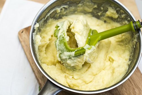 Картофель отвариваем в подсоленной воде. Сливаем воду, пюрируем и вмешиваем сливки, сливочное масло. Добавляем соль и перец по вкусу.